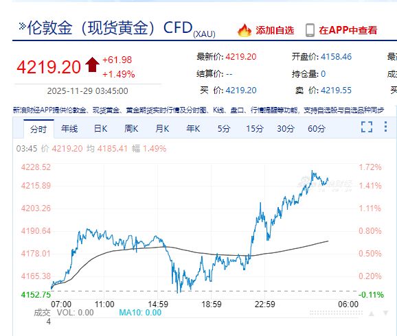 现货黄金报4219.20美元/盎司,日内涨1.49%。