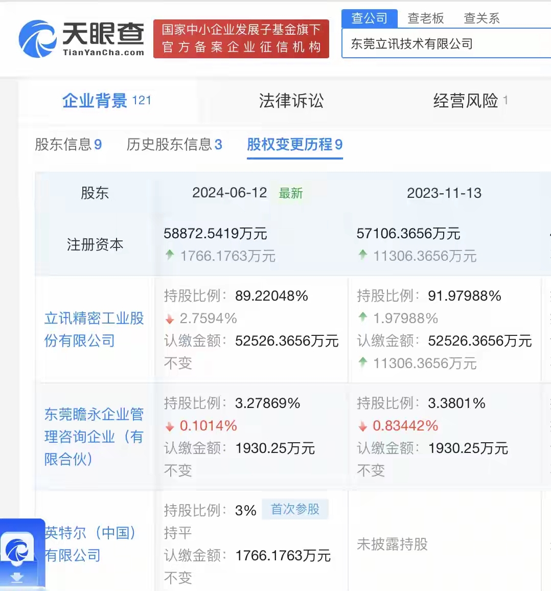 $英特尔(NASDAQ|INTC)$ A股企业立讯精密旗下东莞立讯技术有限公司(下称“东莞立讯技术”)发生工商变更,股东新增英特尔(中国)有限公司。目前,英特尔的持股比例为3%,认缴金额1766.1763万元人民币。