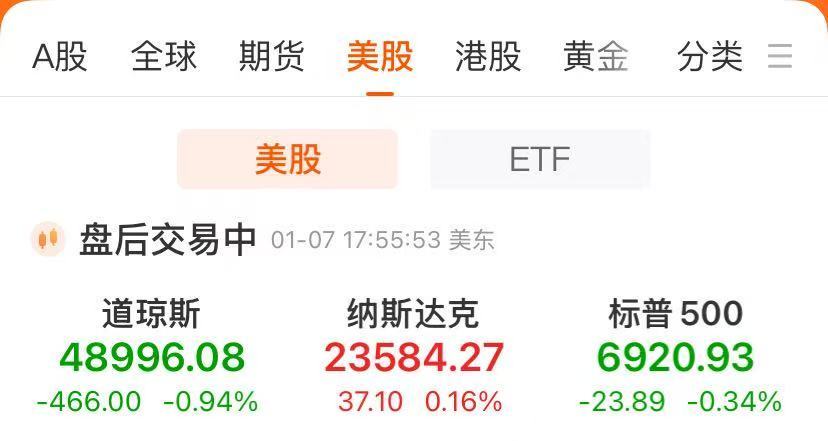 截至收盘,道指跌466.00点,跌幅为0.94%,报48996.08点;纳指涨37.10点,涨幅为0.16%,报23584.27点;标普500指数跌23.89点,跌幅为0.34%,报6920.93点。