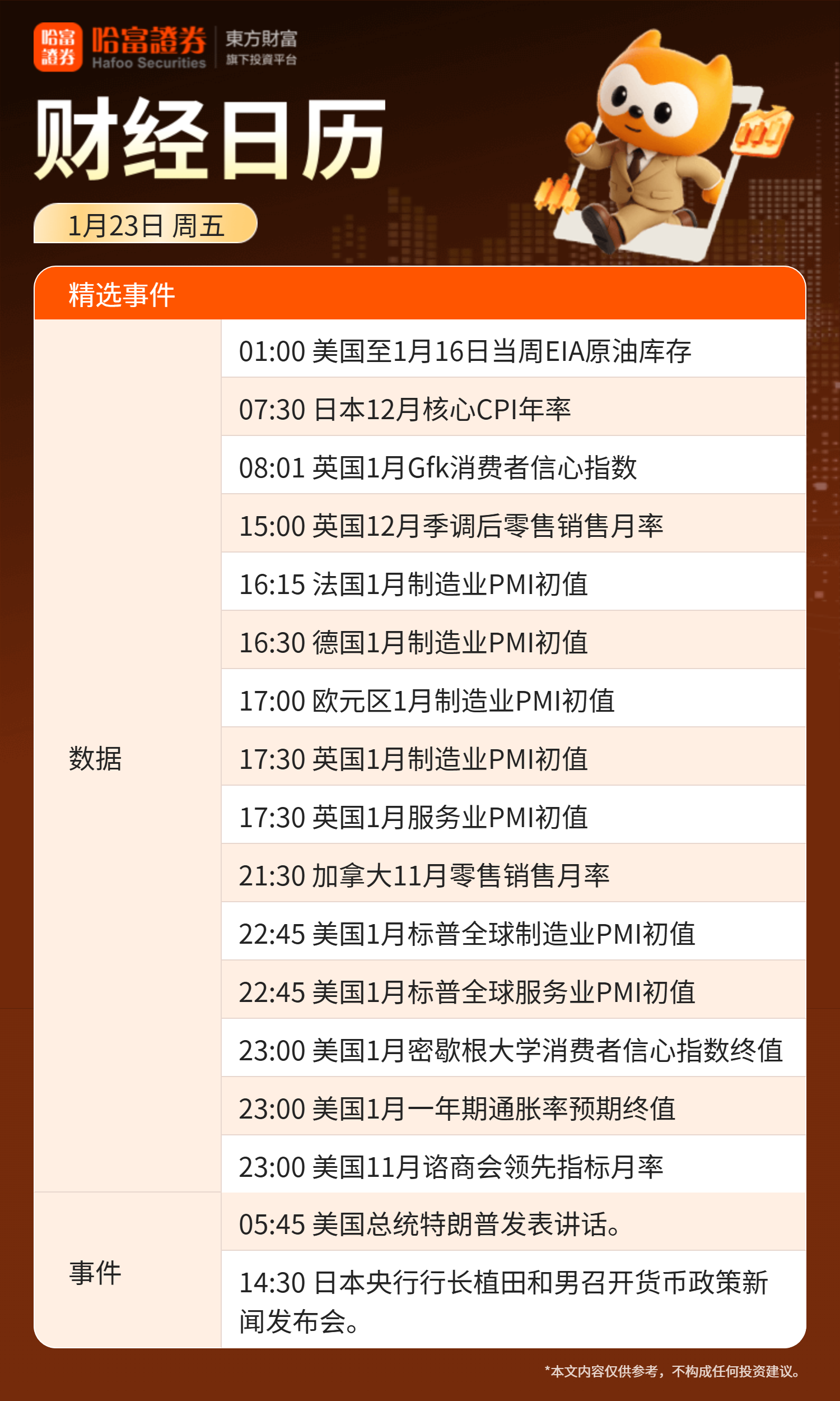 美股市场:美股三大指数01月22日收盘全线上涨。截至收盘,道琼斯工业平均指数比前一交易日上涨306.78点,收于49384.01点,涨幅为0.63%;标准普尔500种股票指数上涨37.73点,收于6913.35点,涨幅为0.55%;纳斯达克综合指数上涨211.2点,收于23436.02点,涨幅为0.91%。