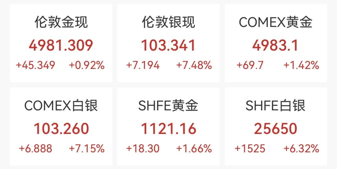 截至收稿,COMEX黄金涨1.42%,报4983.1美元/盎司;COMEX白银涨7.15%,报103.26美元/盎司;现货铂金涨2.7%,报2704.3美元/盎司。