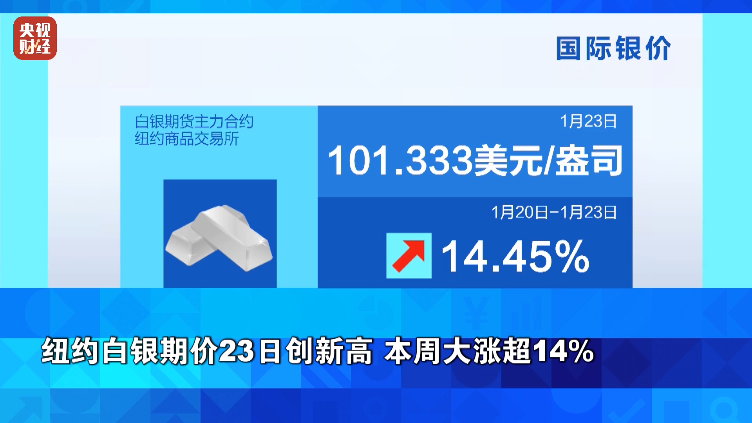 白银期货价格延续强劲涨势,周五突破每盎司100美元整数关口,分别创盘中和收盘历史新高。截至收盘,纽约商品交易所3月交割的白银期价收于每盎司101.333美元,涨幅为5.15%。本周,受现货紧缺、工业需求保持增长,以及避险和投资需求升温等多重因素推动,纽约白银期价累计大幅上涨14.45%。
