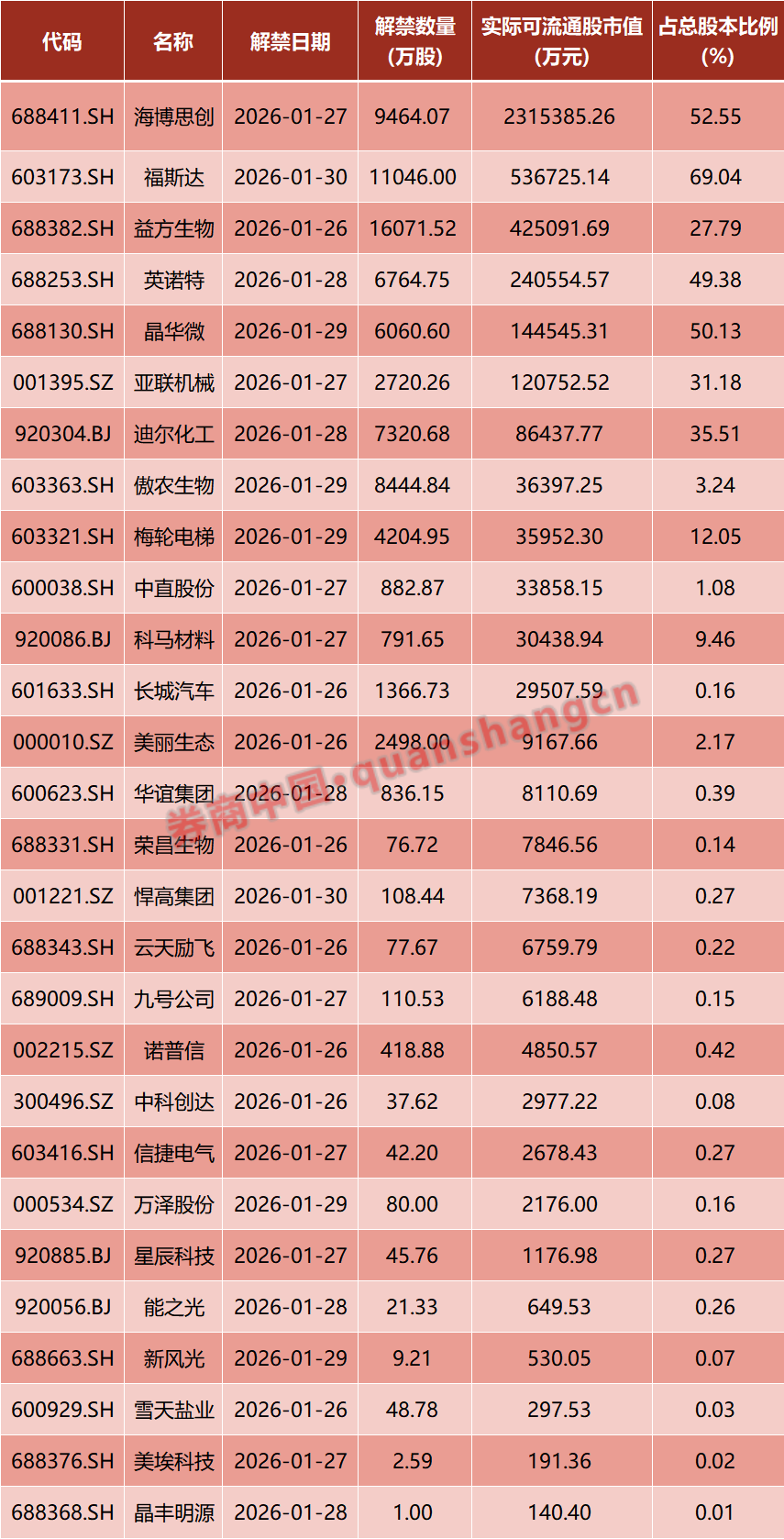 数据显示,本周(1月26日—1月30日)共有28家公司限售股陆续解禁,合计解禁7.96亿股,按最新收盘价计算,解禁总市值为409.68亿元。