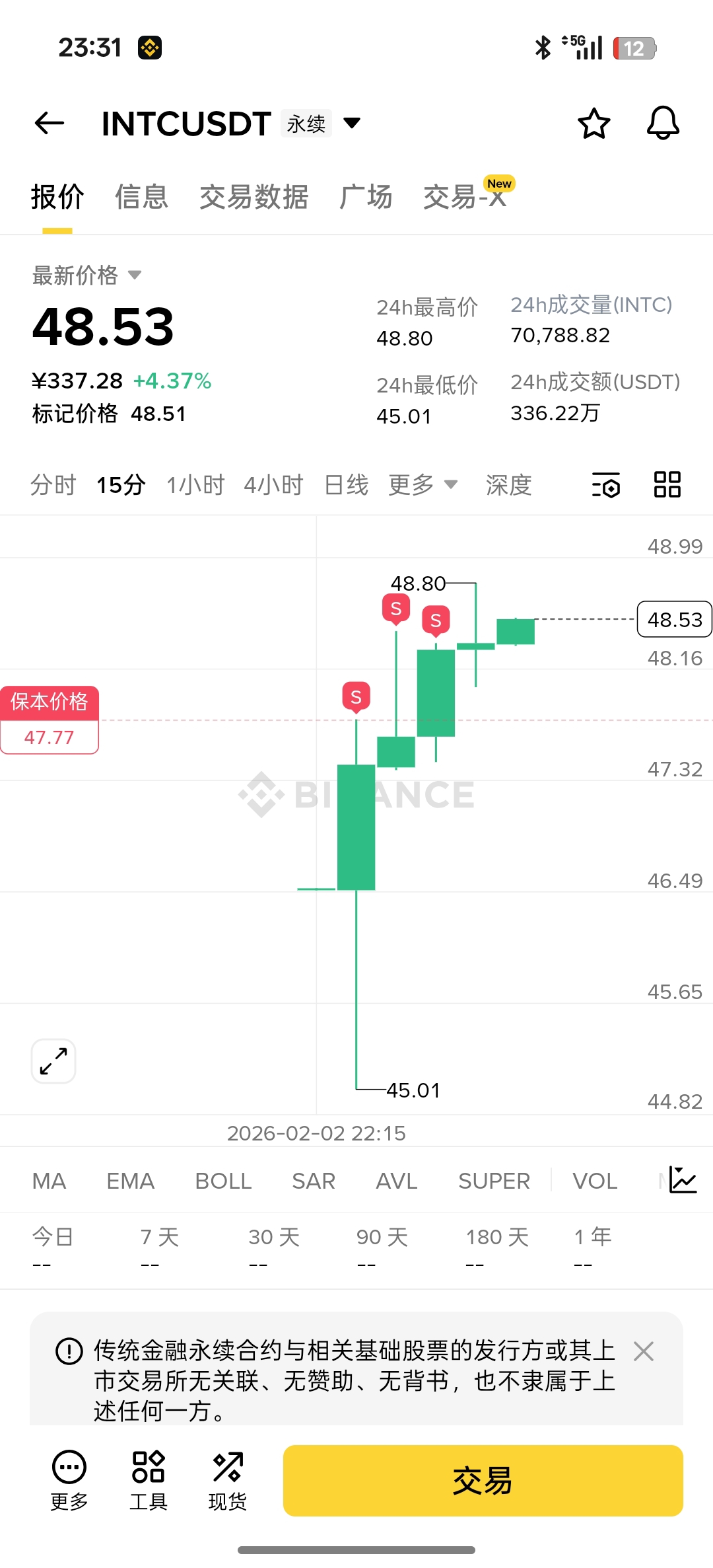 币安今天上了英特尔期货,我还以为是垃圾山寨币,一上去就空空到地板,套死我了真无语