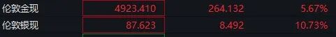 现货黄金大涨,截至发稿,报4923.41美元/盎司,涨逾5%。现货白银报87.62美元/盎司,涨近11%。