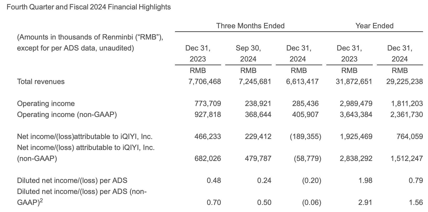 从2024年全年来看,爱奇艺营收292.3亿元,同比下滑8%;净利润7.641亿元,而2023年爱奇艺净利润为19.3亿元。
