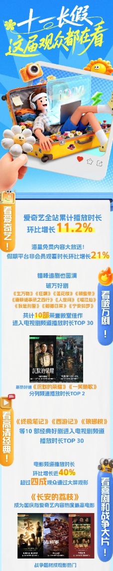 爱奇艺发布国庆假期数据:全站播放时长环比增长11.2%