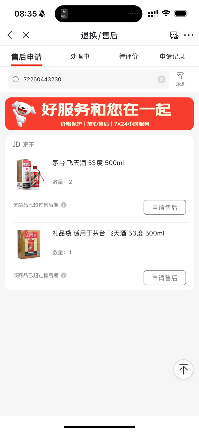 $京东(NASDAQ|JD)$ 京东平台2018年购买的6瓶茅台,3个2瓶独立包装,2024年12月27日晚打开了一个包装,发现是假酒(瓶签上大片污渍,瓶口发黄的开裂,一眼假的那种),已经过了售后服务期现在怎么解决?请刘强东给我回复解决。