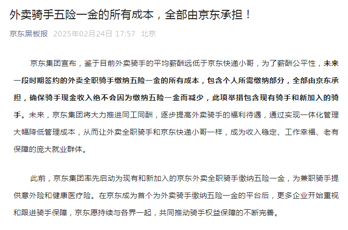 2月24日傍晚,京东集团微信公众号“京东黑板报”发布文章《外卖骑手五险一金的所有成本,全部由京东承担!》。
