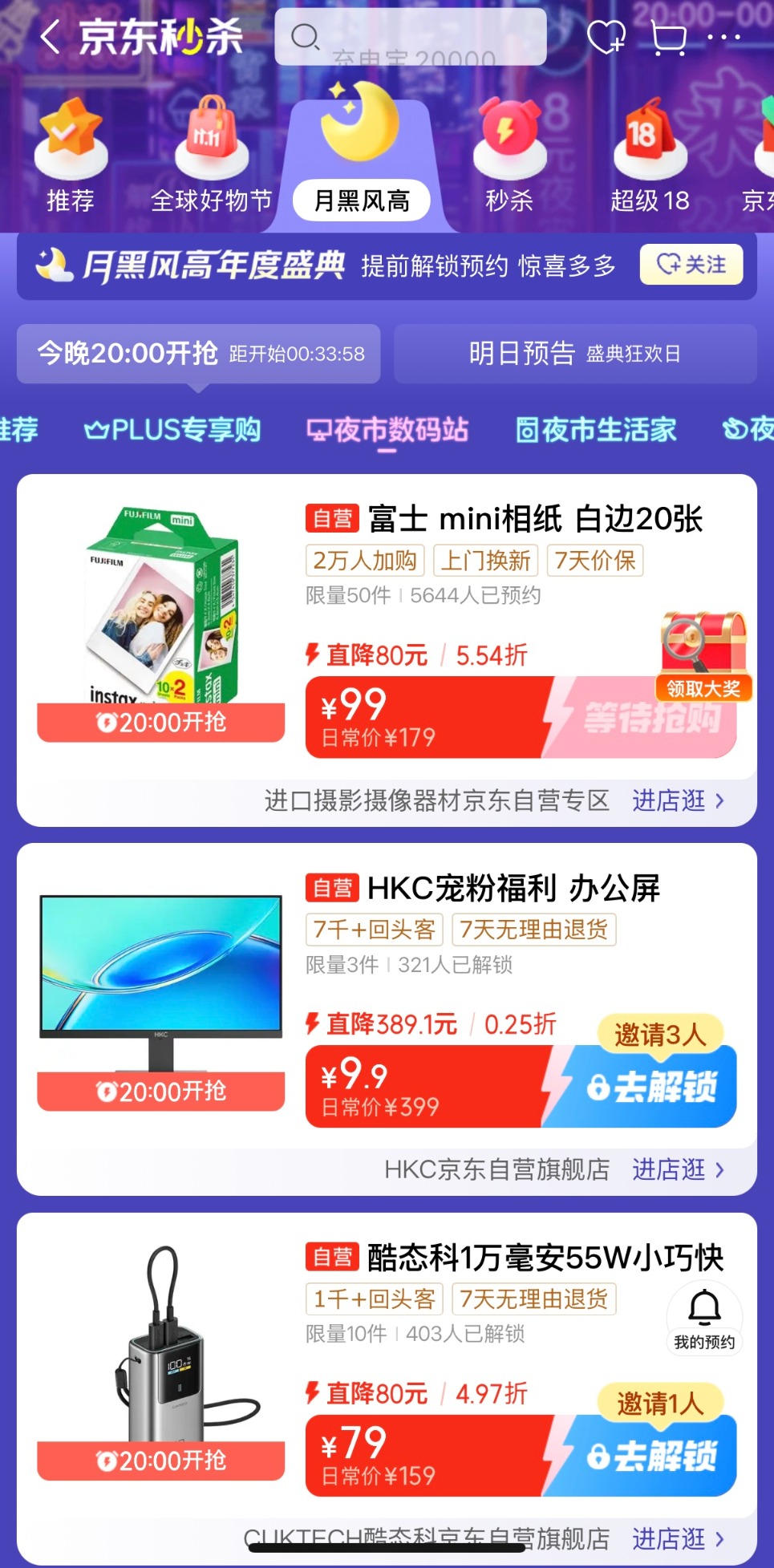 当晚7点50分就已蹲守在京东App的李木(化名)告诉时代财经,他看到月黑风高频道下有多款商品折扣低至1~3折,已提前把几件心仪商品加入购物车。“最想抢的是一款拍立得相纸,原价179元,折后99元,还提前在直播间抢到红包”。没想到8点一到,场面过于火爆,仍与之失之交臂。到了9点50分,其又参与了一轮耳机的抢购,不过仍未抢到。“只能蹲蹲看明天了。”他说。