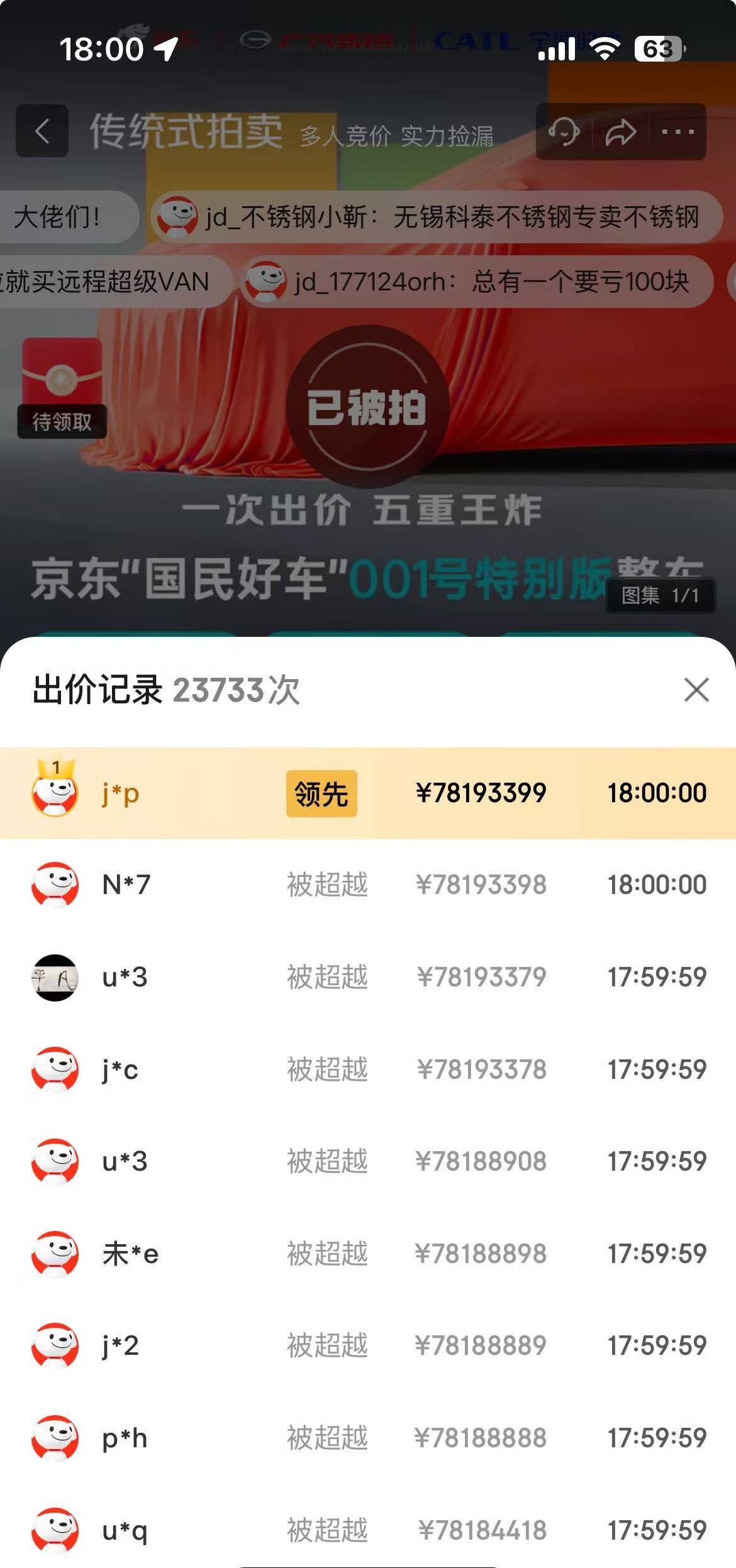 10月22日14时,京东001号“国民好车”在京东拍卖平台正式开拍,至18时结束时,最终价格为7819.3399万元,京东用户@j*p竞拍成功,出价记录共23733次。拍卖页面显示,开拍几秒后,价格就达到了10万元,接下来1分钟超80万元,至16分钟已超过1000万元。