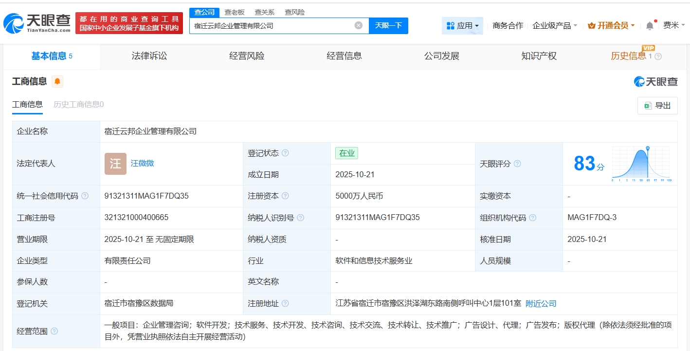 每经AI快讯,天眼查App显示,近日,宿迁云邦企业管理有限公司成立,法定代表人为汪微微,注册资本5000万元人民币,经营范围包括企业管理咨询、软件开发、广告发布等,由京东旗下宿迁涵邦投资管理有限公司全资持股。