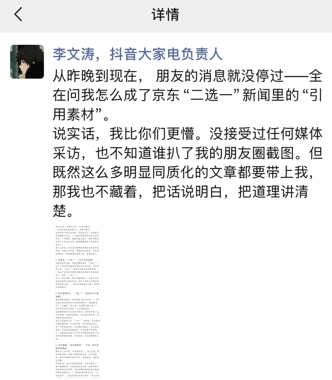 但在10月30日,抖音大家电负责人李文涛在朋友圈发文,称京东“二选一”属实,并表示:“京东此前也将类似行为界定为‘二选一’。”