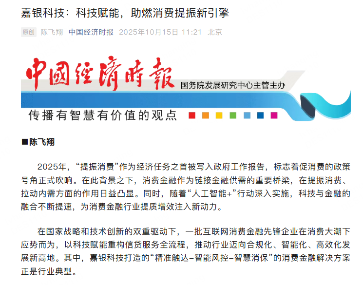 中国经济时报:嘉银以科技赋能,助燃消费提振新引擎10月15日,由国务院发展研究中