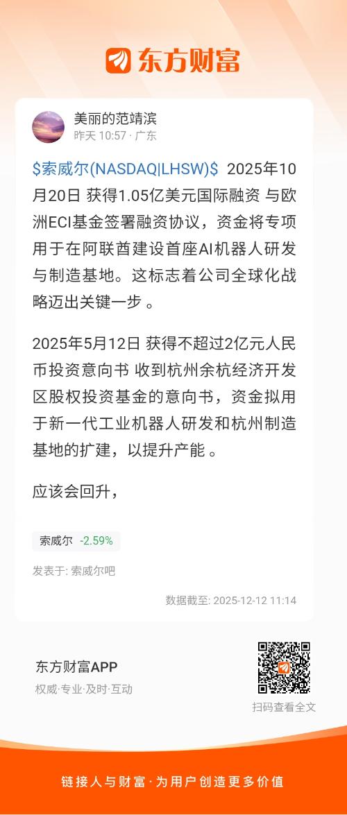 $索威尔(NASDAQ|LHSW)$ 2025年10月20日 获得1.05亿美元国际融资 与欧洲ECI基金签署融资协议,资金将专项用于在阿联酋建设首座AI机器人研发与制造基地。这标志着公司全球化战略迈出关键一步 。