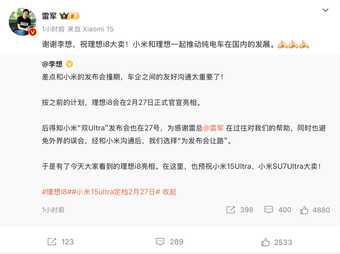 2月25日下午,李想发文称,按之前的计划,理想i8会在2月27日正式官宣亮相。“后得知小米‘双Ultra’发布会也在27号,为感谢雷总(雷军)在过往对我们的帮助,同时也避免外界的误会,经和小米沟通后,我们选择‘为发布会让路’。”