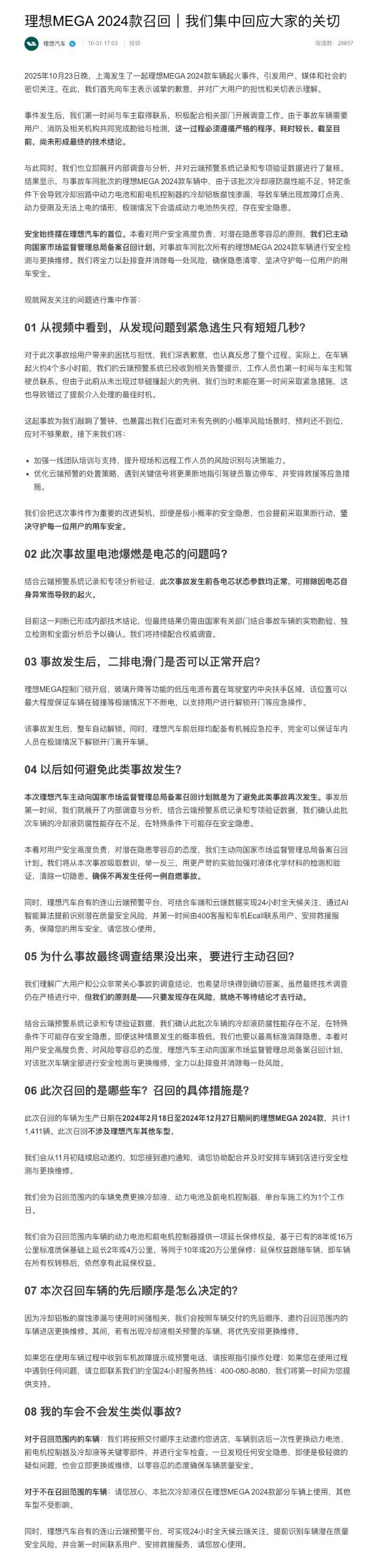 10月31日傍晚,理想汽车官方就上海理想MEGA车辆起火事件向车主表达歉意,并宣布将召回事故车同批次所有的理想MEGA 2024款汽车,共计11411辆,进行安全检测与更换维修。