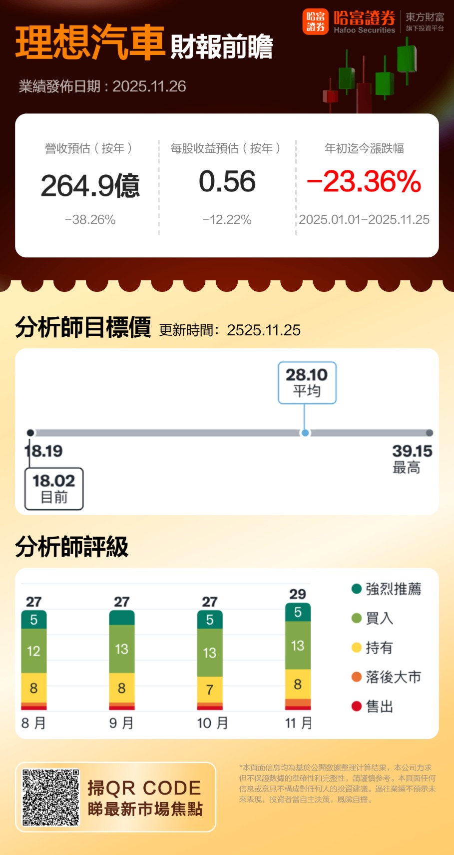 展望未来,纯电车型产能的持续释放、四季度 “双十一” 促销带来的交付反弹、海外市场的逐步拓展,将成为推动业绩回升的核心动力。本次财报的核心看点在于:纯电交付进度是否出现改善、毛利率能否维持盈利韧性、海外初始订单是否达预期。这些数据将直接验证公司转型成效,为后续估值重构提供重要指引。
