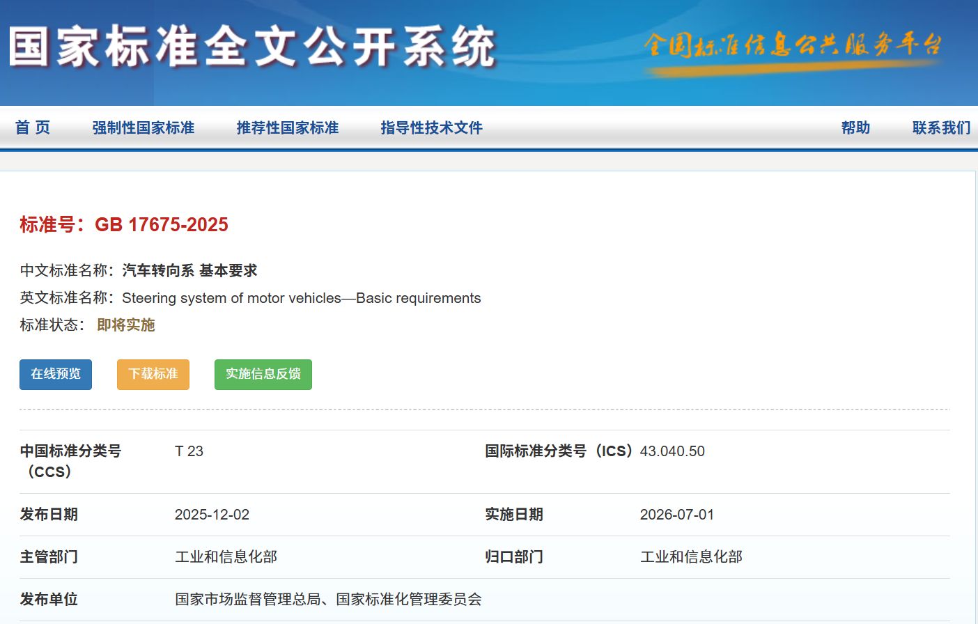 随着线控转向技术加速装车应用,新版汽车转向系统国家标准也正式发布。1月26日,由工业和信息化部组织制定的强制性国家标准《汽车转向系基本要求》(GB17675-2025)(以下简称新国标),已由国家市场监督管理总局、国家标准化管理委员会批准发布,并将于2026年7月1日起正式实施。
