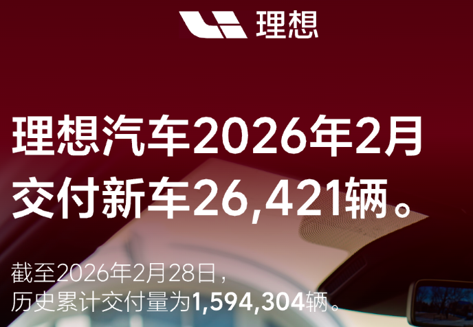 3月1日,理想汽车公布2026年2月交付数据。2026年2月,理想汽车交付新车26,421辆。截至2026年2月28日,理想汽车历史累计交付量为1,594,304辆。