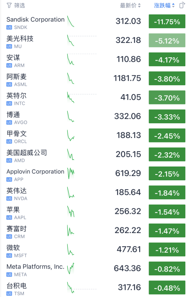 纳斯达克100指数一度下跌1%,因英伟达和苹果等科技巨头下挫,此外,存储芯片板块集体暴跌。