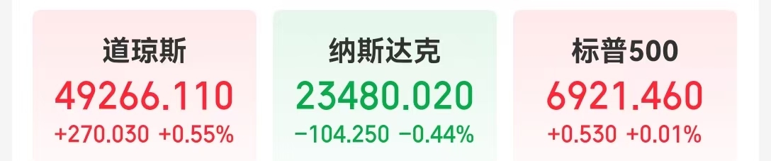 当地时间1月8日,美股三大指数收盘涨跌不一,道指涨0.55%,标普500指数涨0.01%,纳指跌0.44%。