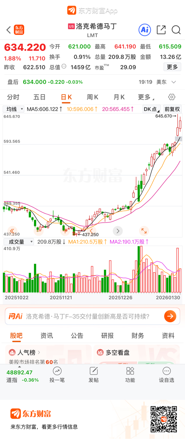 #社区牛人计划# $洛克希德马丁(NYSE|LMT)$ $中航成飞(SZ302132)$ 同为军工企业,技术水平处在同一档次甚至高那么一点点,洛马创出历史新高,成飞跌跌不休。