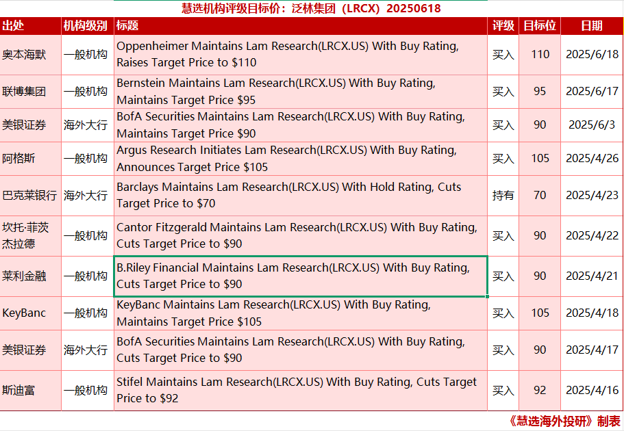 慧选机构评级目标价:泛林集团(LRCX)20250618