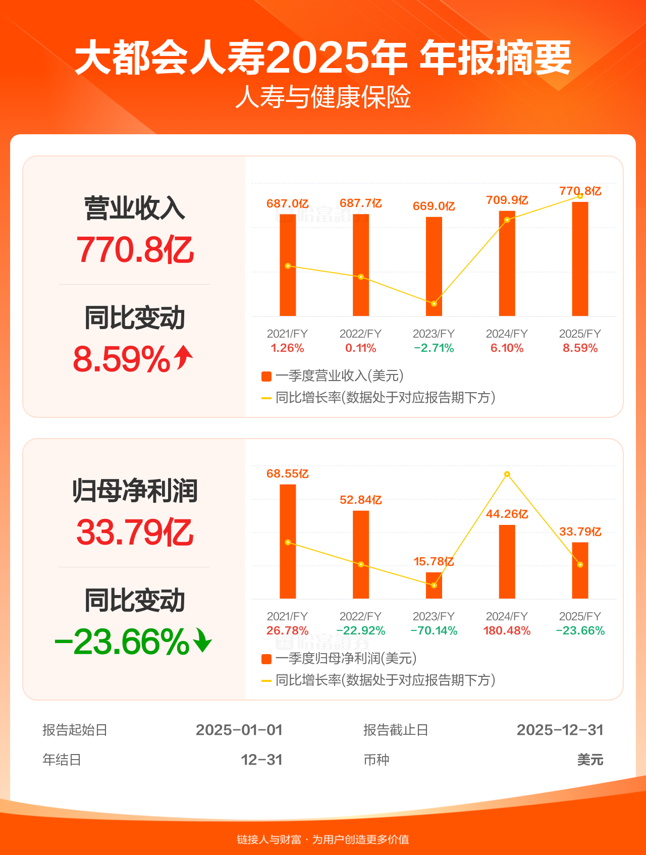 大都会人寿2月4日发布年报业绩,截至2025年12月31日的12个月内,该公司营业收入770.84亿美元,同比增长8.59%;公司权益持有人应占溢利(归母净利润)33.79亿美元,同比减少23.66%。