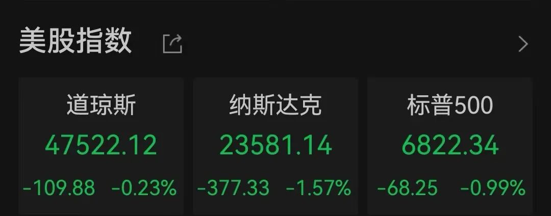 当地时间10月30日,美股三大股指全线收跌,Wind数据显示,截至收盘,道指跌0.23%,报475522.12点;标普500指数跌0.99%,报6822.34点;纳指跌1.57%报23581.14点。