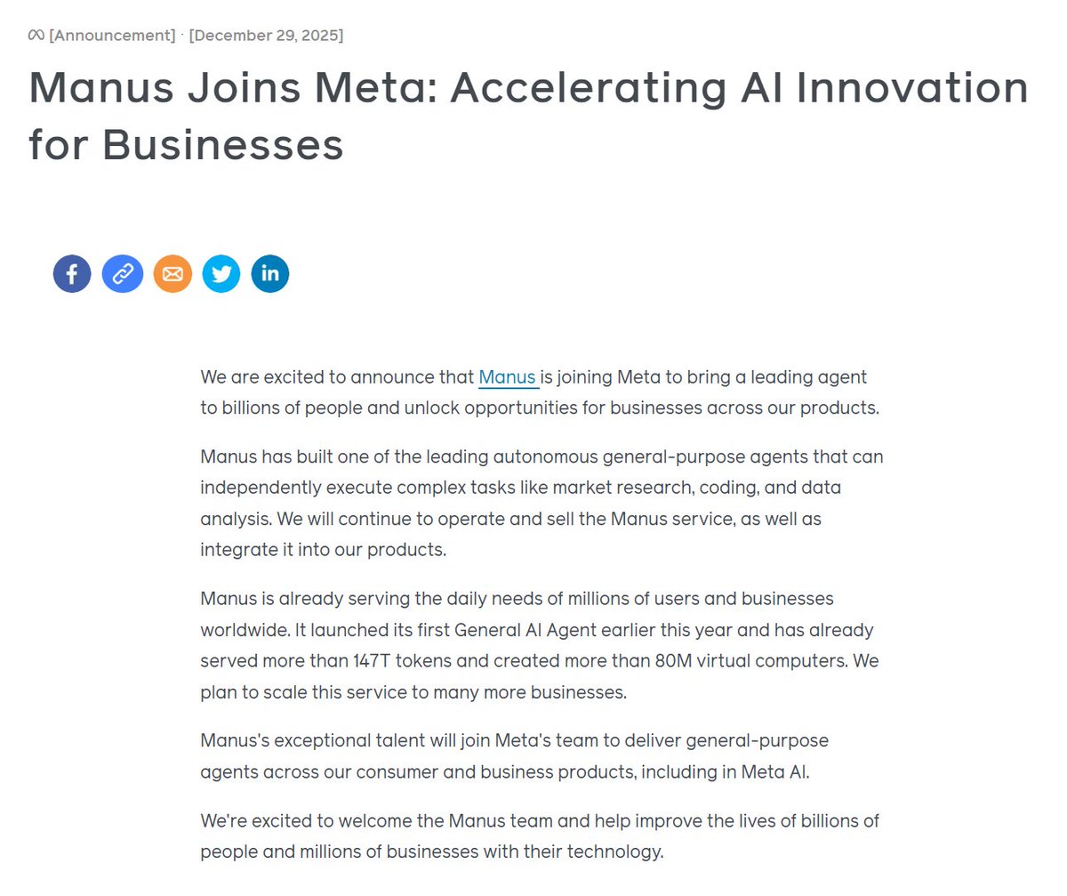 Meta宣布完成了一项大收购,将AI Agent初创公司Manus收入麾下。