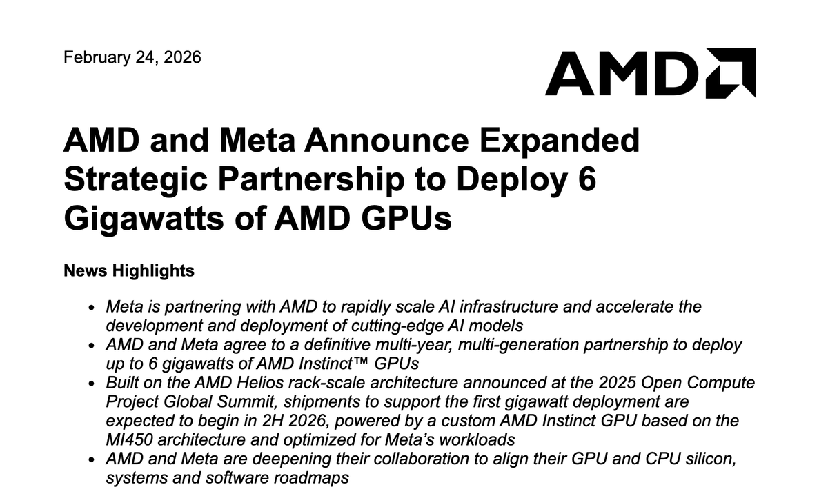 Meta与AMD签署多年、多代合作协议协议,以快速扩展AI基础设施,并加速尖端模型的开发和部署。Meta将部署高达6吉瓦的AMD Instinct GPU,5年内向Meta购买价值600亿美元的AI芯片,同时可收购AMD至多10%的股份。