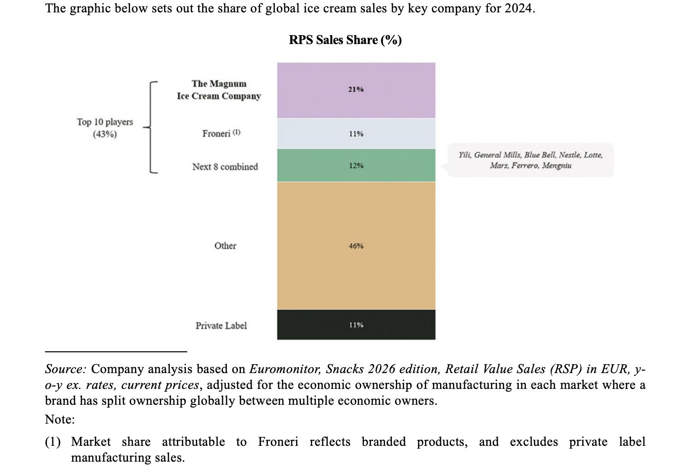 由此看来,梦龙冰淇淋公司实际上是一家发展已有百年的企业。根据梦龙冰淇淋公司招股书,按照2024年销售额计算,该公司在全球冰淇淋市场占据21%的市场份额,位居第一位,紧随其后的是冰淇淋生产商Froneri,市占率为11%,后续包括蒙牛、伊利、雀巢、玛氏等在内的8家公司合计占有12%的市占率。