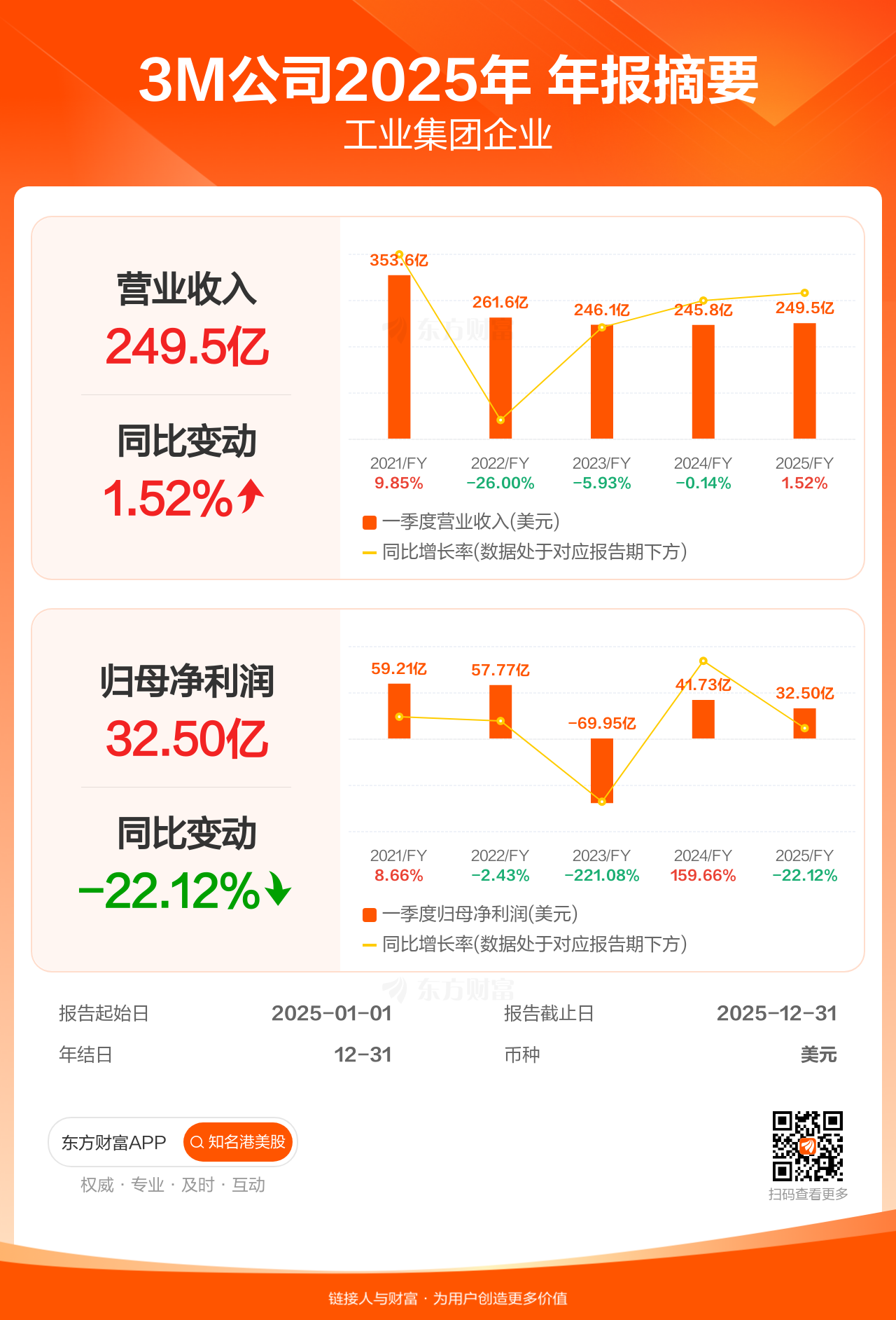 3M公司1月20日发布年报业绩,截至2025年12月31日的12个月内,该公司营业收入249.48亿美元,同比增长1.52%;公司权益持有人应占溢利(归母净利润)32.50亿美元,同比减少22.12%。