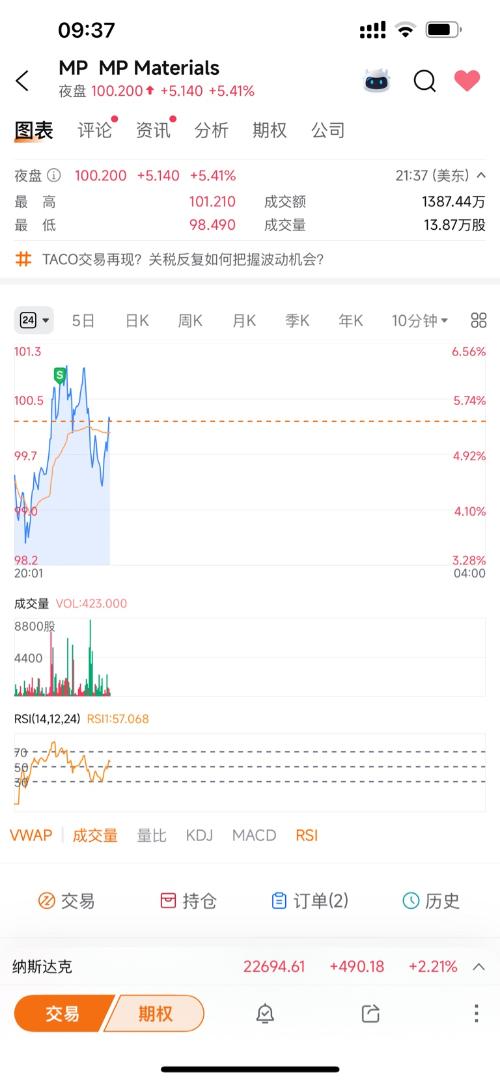 本帖新建仓的MP今早冲击100刀历史新高67刀买入,买入第二天开始上涨,10个工作日上涨49%,说明浪型分析正确一起变富,我们一直在路上今天早上100刀开始卖出,跟我们之前的6个翻倍的标的一样,先把本金提出来,整体卖出计划和买回位置后续有时间会发。$MP Materials Corp-A(NYSE|MP)$