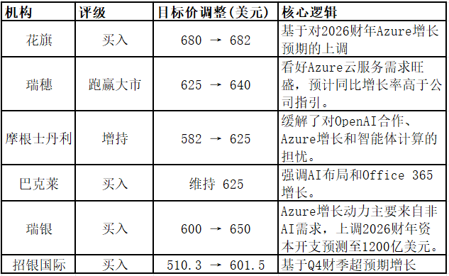 各大机构普遍看好微软前景,评级以“买入”为主,上调主要受Azure增长、AI布局和25Q4财季超预期驱动。但仍需关注数据中心供应短缺和资本开支风险。