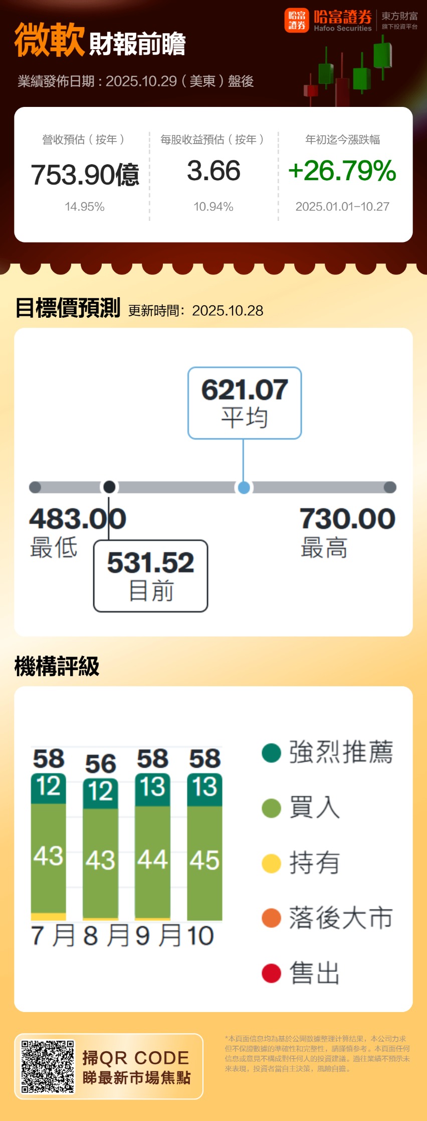 微软将在10月29日美股盘后发布26财年第一季度财报(注:微软财年与自然年不同步)。市场聚焦Azure与Copilot在企业侧的落地速度与商业云合同能见度的延续。机构预期微软2026Q1预计实现营收753.90亿美元,同比增加14.95%;预期每股收益3.66美元,同比增加10.94%。