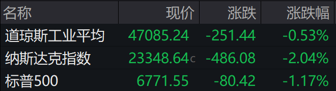 大型科技股多数下跌,微软下跌0.52%,亚马逊下跌1.84%,谷歌A下跌2.18%,英伟达下跌3.96%,特斯拉大跌5.15%,Meta下跌1.63%,仅苹果微涨0.37%。