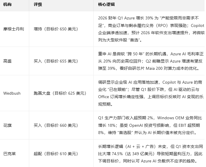 看多派(摩根士丹利、高盛):认为 Copilot 和 Azure AI 的企业级渗透已进入加速期,自研芯片与效率提升将推动 AI 毛利率回升,长期增长确定性高;谨慎派(巴克莱):担忧资本开支高企对利润率的压制,认为短期盈利质量可能受 AI 基础设施投入拖累。