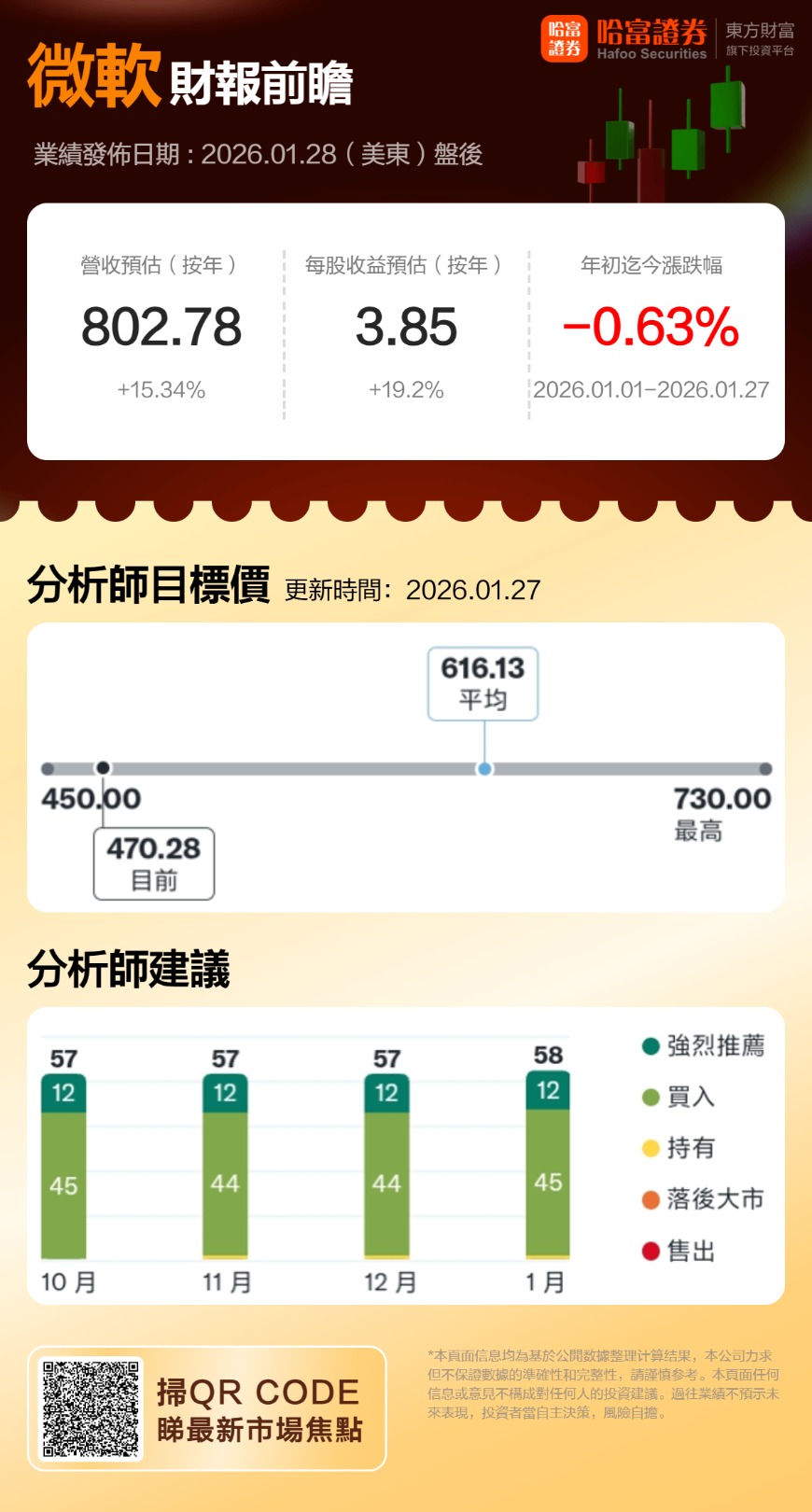 微软将于美东时间1月28日美股盘后(北京时间周四晨间)发布2026财年第二季度(对应自然月份2025年10月至12月)业绩,机构预期2026Q2实现营收802.78亿美元,同比增加15.34%;预期每股收益3.85美元,同比增加19.2%。