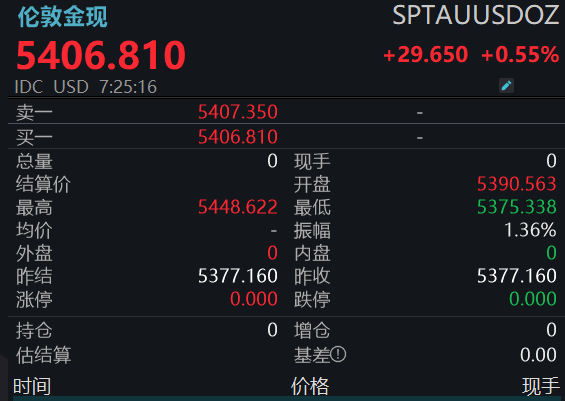 30日早盘,现货黄金日内涨幅扩大至1%,截至北京时间7时27分发稿,盘中最高报5448.62美元/盎司。