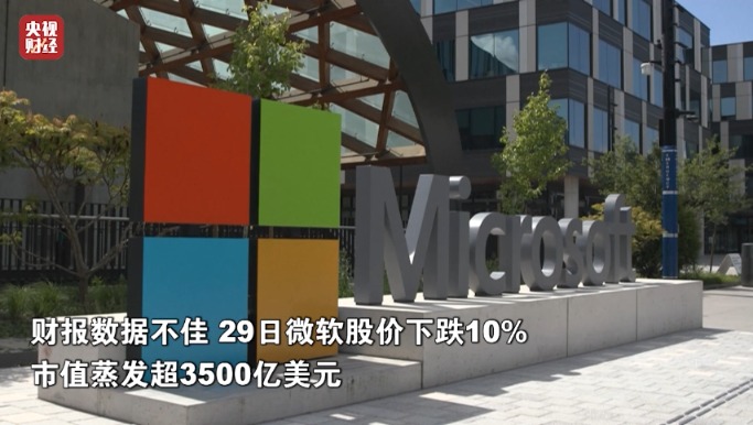 财报数据不佳 29日微软股价下跌10% 市值蒸发超3500亿美元