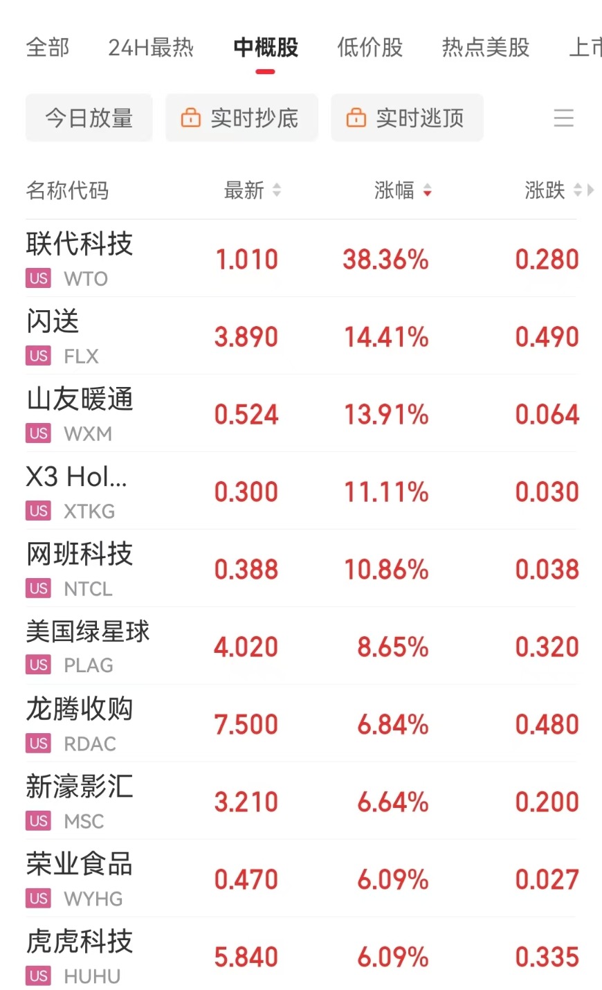 中国资产表现亮眼,纳斯达克中国金龙指数收涨0.90%,热门中概股多数上涨,蔚来涨超5%,理想汽车涨超2%,哔哩哔哩涨超1%。联代科技涨超38%,闪送涨超14%。