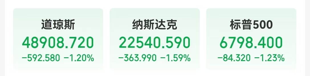 当地时间2月5日,美股三大指数集体收跌,道指下跌592.58点,跌幅1.20%;纳指跌1.59%;标普500指数跌1.23%。