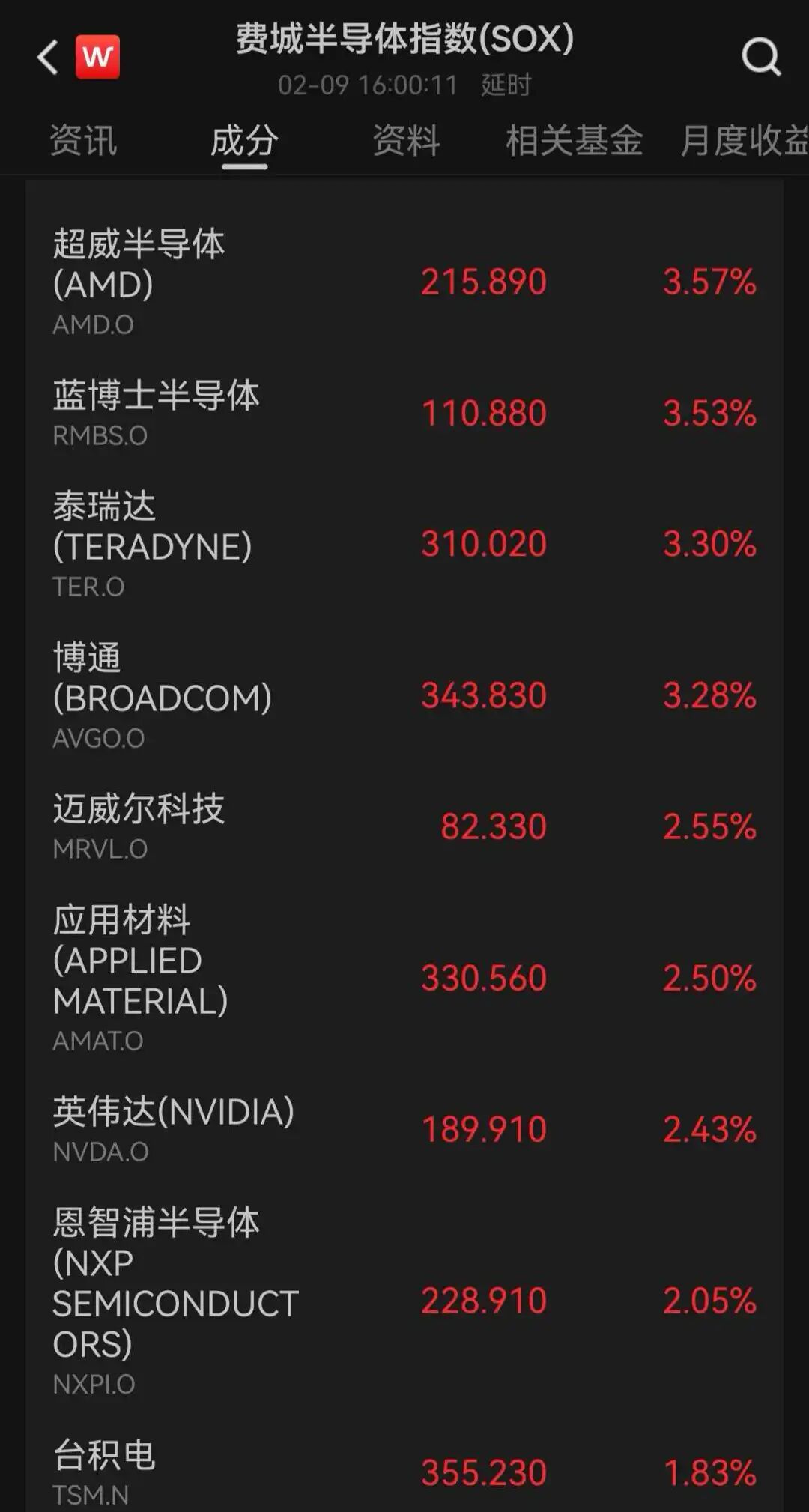 芯片股多数上涨,费城半导体指数涨1.42%。个股方面,超威半导体、博通等涨超3%,应用材料涨超2%,台积电涨超1%。