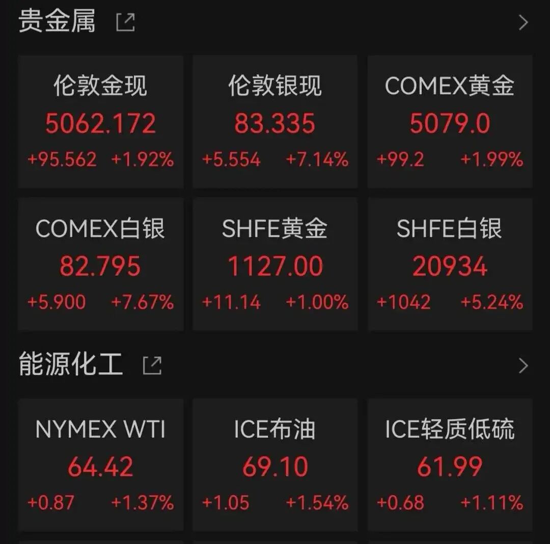 截至北京时间2月10日5:49,伦敦现货黄金报5062.172美元/盎司,涨1.92%;COMEX黄金期货报5079美元/盎司,涨1.99%;伦敦现货白银、COMEX白银期货均涨超7%,分别报83.335美元/盎司、82.795美元/盎司。