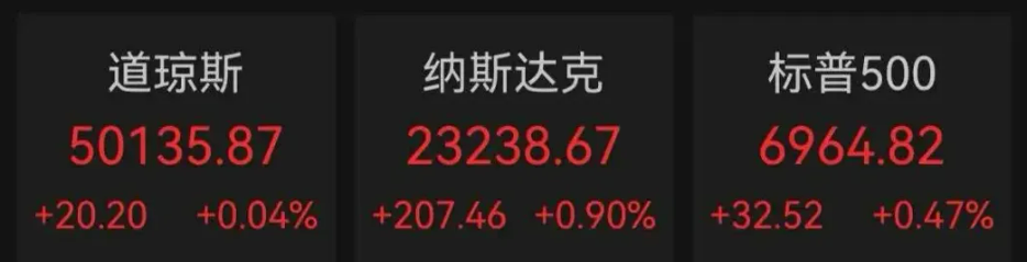 Wind数据显示,截至收盘,道琼斯工业指数涨0.04%,创历史新高;纳斯达克指数涨0.9%,标普500指数涨0.47%。