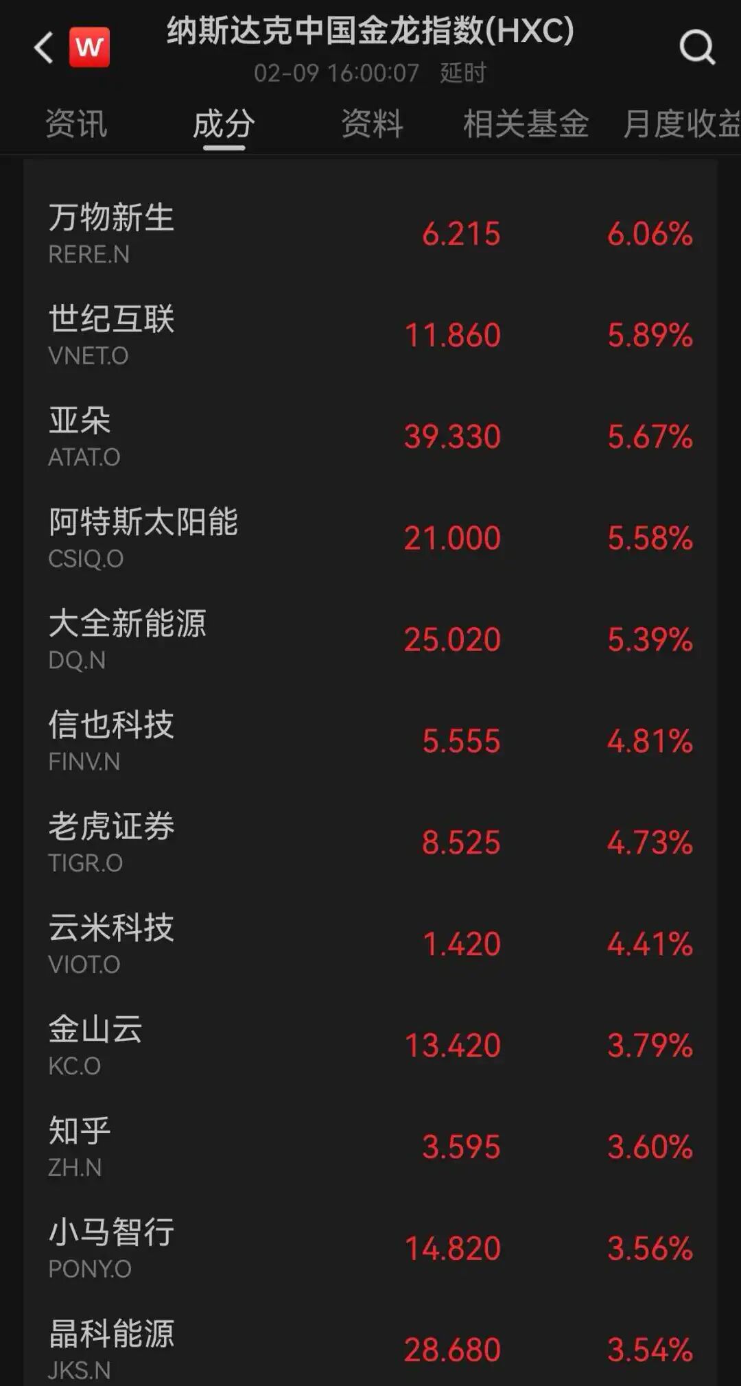 中概股涨跌不一,纳斯达克中国金龙指数涨0.12%。个股方面,万物新生涨超6%,世纪互联、亚朵、阿特斯太阳能、大全新能源涨超5%。