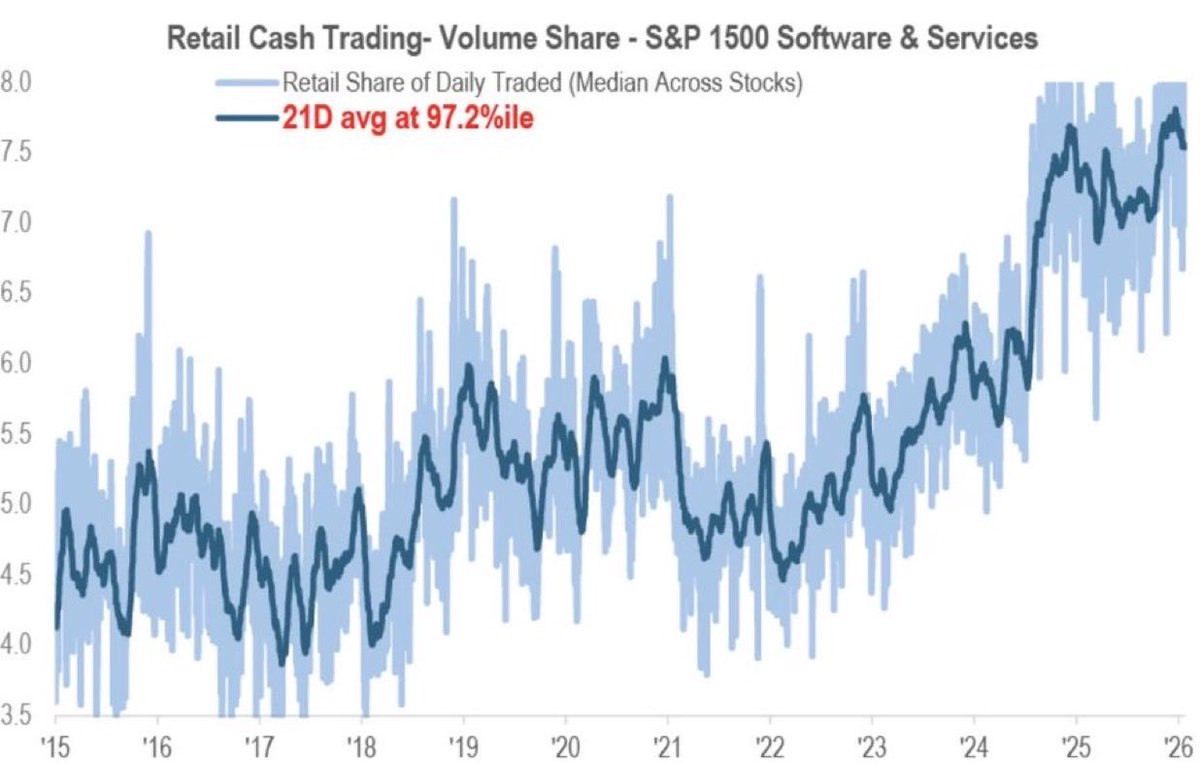 在华尔街因担忧人工智能影响而抛售软件股之际,散户却在积极买入。根据摩根大通的数据,尽管标普综合1500软件与服务指数已下跌约20%,交易活动仍接近历史高位。