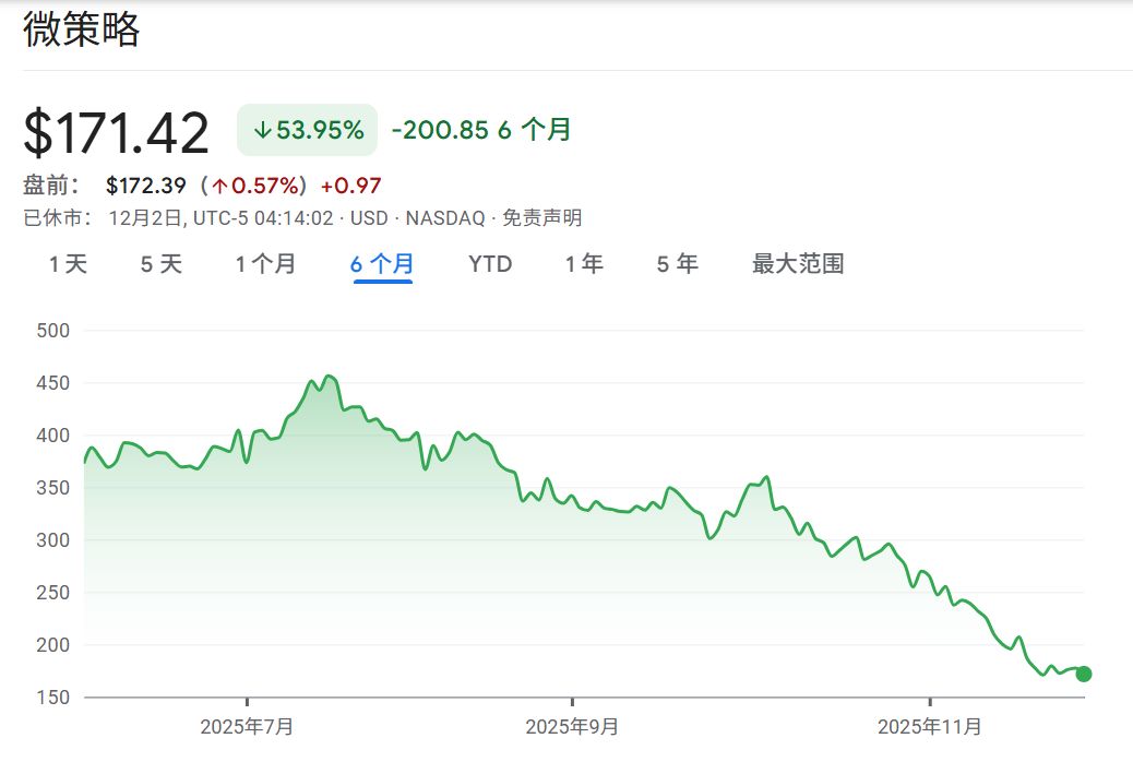 12月1日,Strategy股价遭遇重挫,盘中跌幅一度达12.2%,最低触及155.6美元,收盘时跌幅收窄至3.3%。